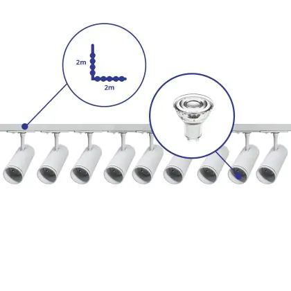 Beschreibung Komplettset 1-Phasen Rail L 2 x 2 Meter Weiß | incl. 9x Spot + GU10 2700K 3W Dimmbar + Abschlusskappe, Stromanschluss und L -Verbinder