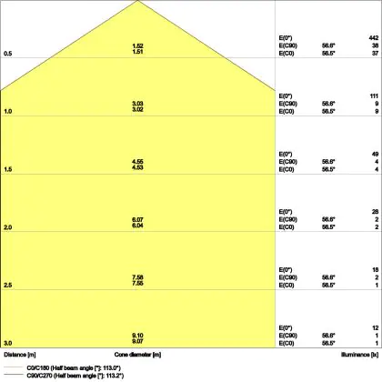 Der Abstrahlwinkel bezeichnet den Winkel, in dem das Licht aus der Lichtquelle ausgestrahlt wird. Er wird in Grad (D) angegeben. Je geringer die Gradzahl des Abstrahlwinkels ist, desto kleiner ist auch der Durchmesser des Lichtkegels, den die Lichtquelle produziert. Beispiel: Wird eine Lampe mit einem Abstrahlwinkel von 60 Grad an der Decke (2,5 m Höhe) angebracht, erzeugt sie einen Lichtkegel von 2,9 Metern Durchmesser. Hat die Lampe hingegen einen Abstrahlwinkel von 120 Grad, beträgt der Lichtkegel 8,7 Meter im Durchmesser. |