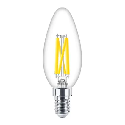 Die Mehrfachpackung 10x Philips MASTER LED E14 Kerze Fadenlampe Klar 3.4W 470lm - 922-927 Dim To Warm | Höchste Farbwiedergabe - Dimmbar - Ersatz Für 40W ist eine effiziente E14 LED-Lampe mit Retrodesign und der perfekte Ersatz für Ihre konventionellen 40W Lampen mit E14. Zudem strahlt sie Licht in der Farbtemperatur 2200K - 2700K Dim To Warm aus und punktet durch eine lange Lebensdauer.