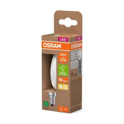 Die Osram LED Classic E14 Kerze Fadenlampe Matt 1.2W 255lm - 827 Extra Warmweiß | Ersatz Für 25W ist eine effiziente E14 LED-Lampe mit Retrodesign und der perfekte Ersatz für Ihre konventionellen 25W Lampen mit E14. Zudem strahlt sie Licht in der Farbtemperatur 2700K - Extra Warmweiß aus und punktet durch eine lange Lebensdauer.