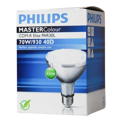 CDM-R Elite sind kompakte Entladungslampen, die mit Reflektoren ausgestattet sind und einen sehr guten Lumenerhalt vom ersten bis zum letzten Einsatz aufweisen. Die Philips CDM-R Elite 70W 930 E27 PAR30L 40D (MASTERColour) ist eine kompakte Leuchtstofflampe mit einem E27 Lampensockel. Dieser Lampensockel ermöglicht einen einfachen und schnellen Austausch. Es ist nicht möglich, diese Lampen zu dimmen.
